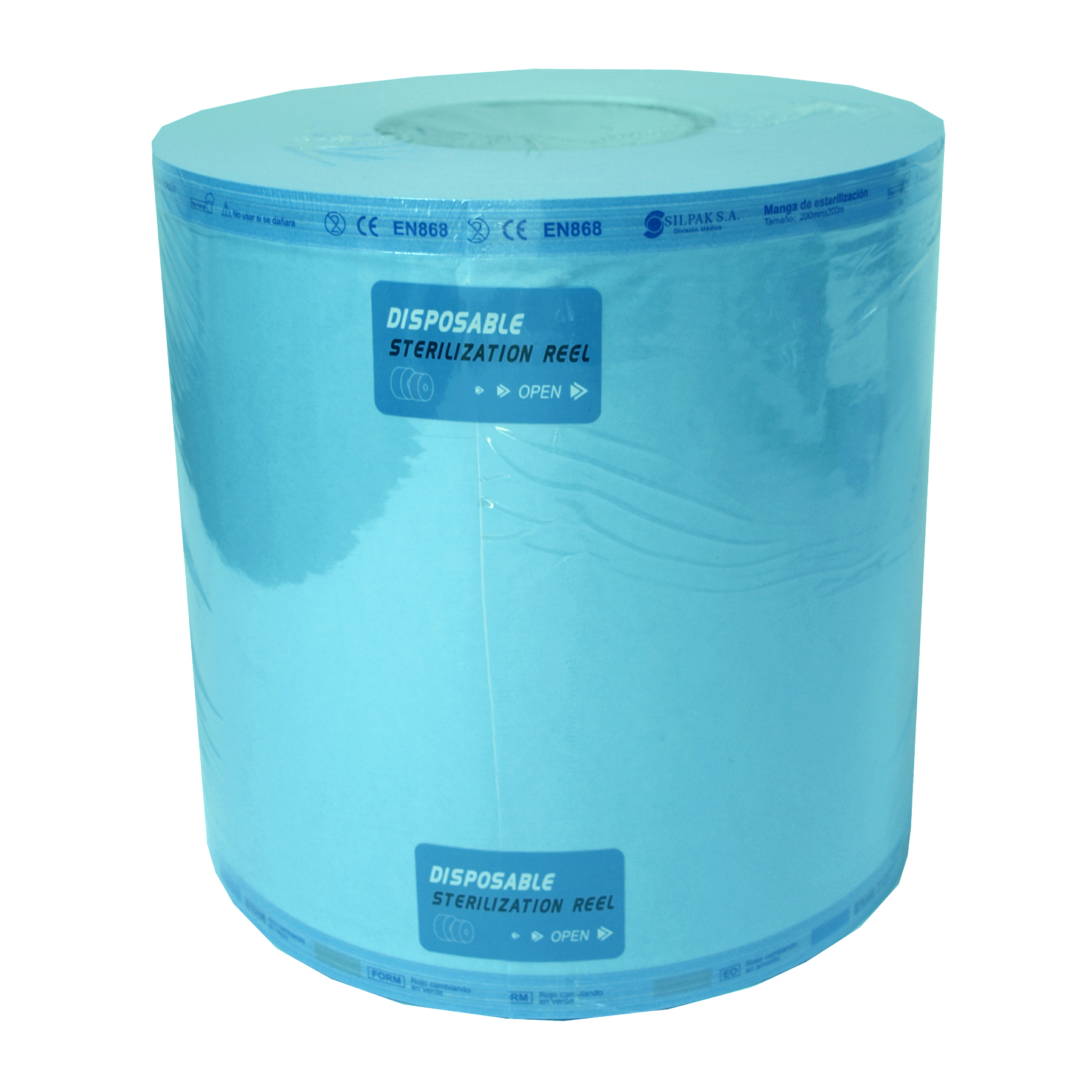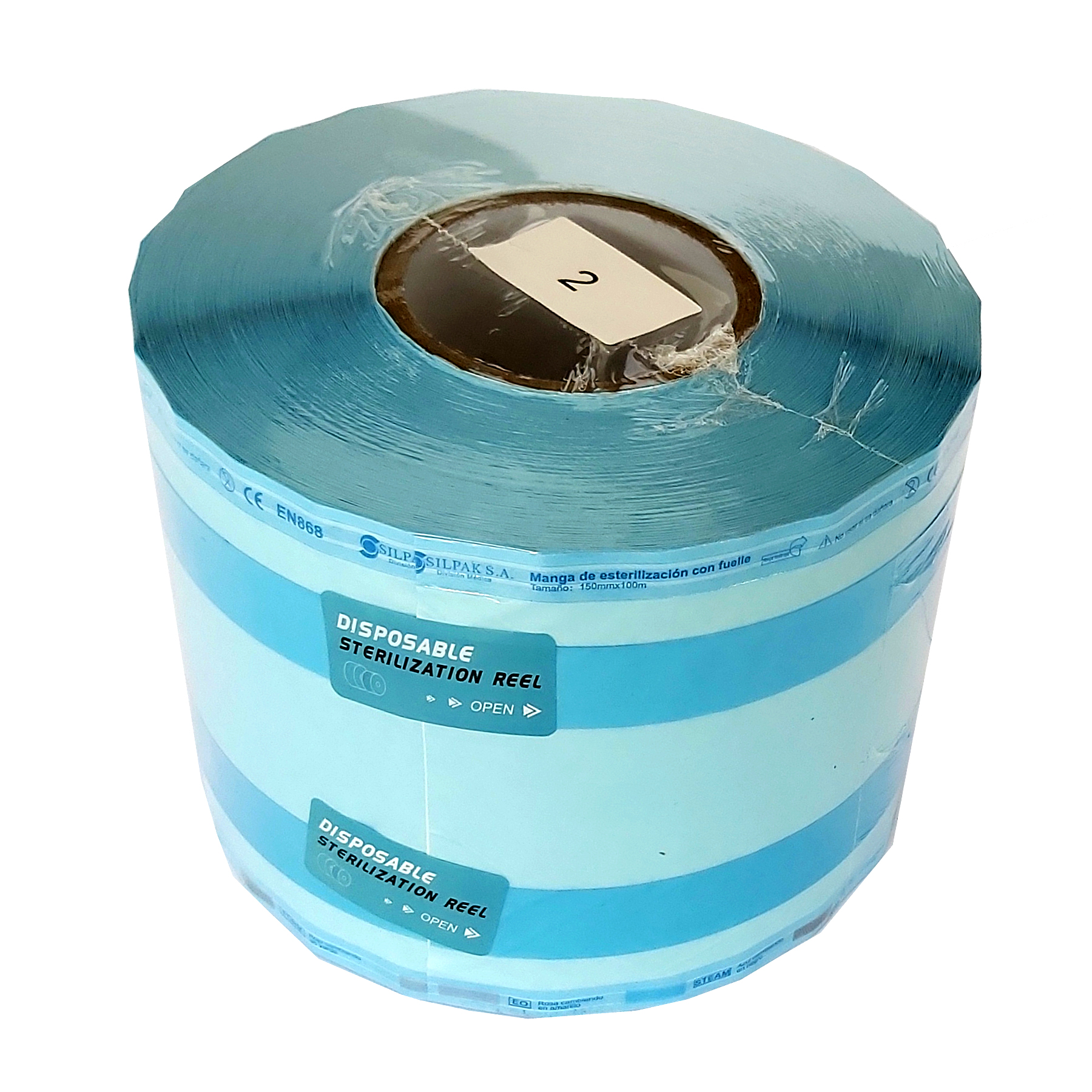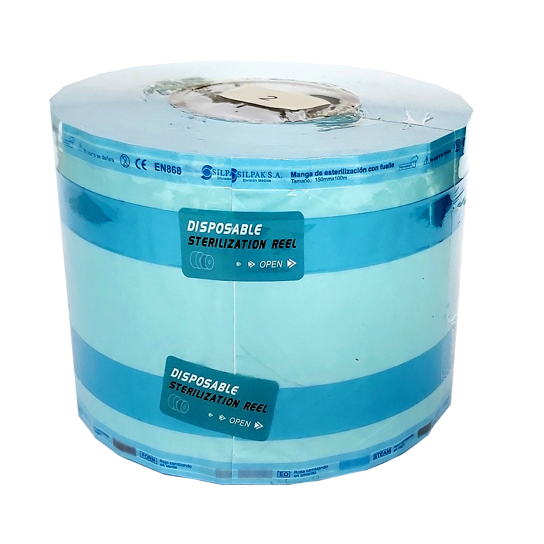 Manga de papel bilaminado compuesta por una lámina de papel grado médico con un gramaje de 60 g/m² y una lámina de plástico transparente o translúcida que permita la visibilidad del contenido.