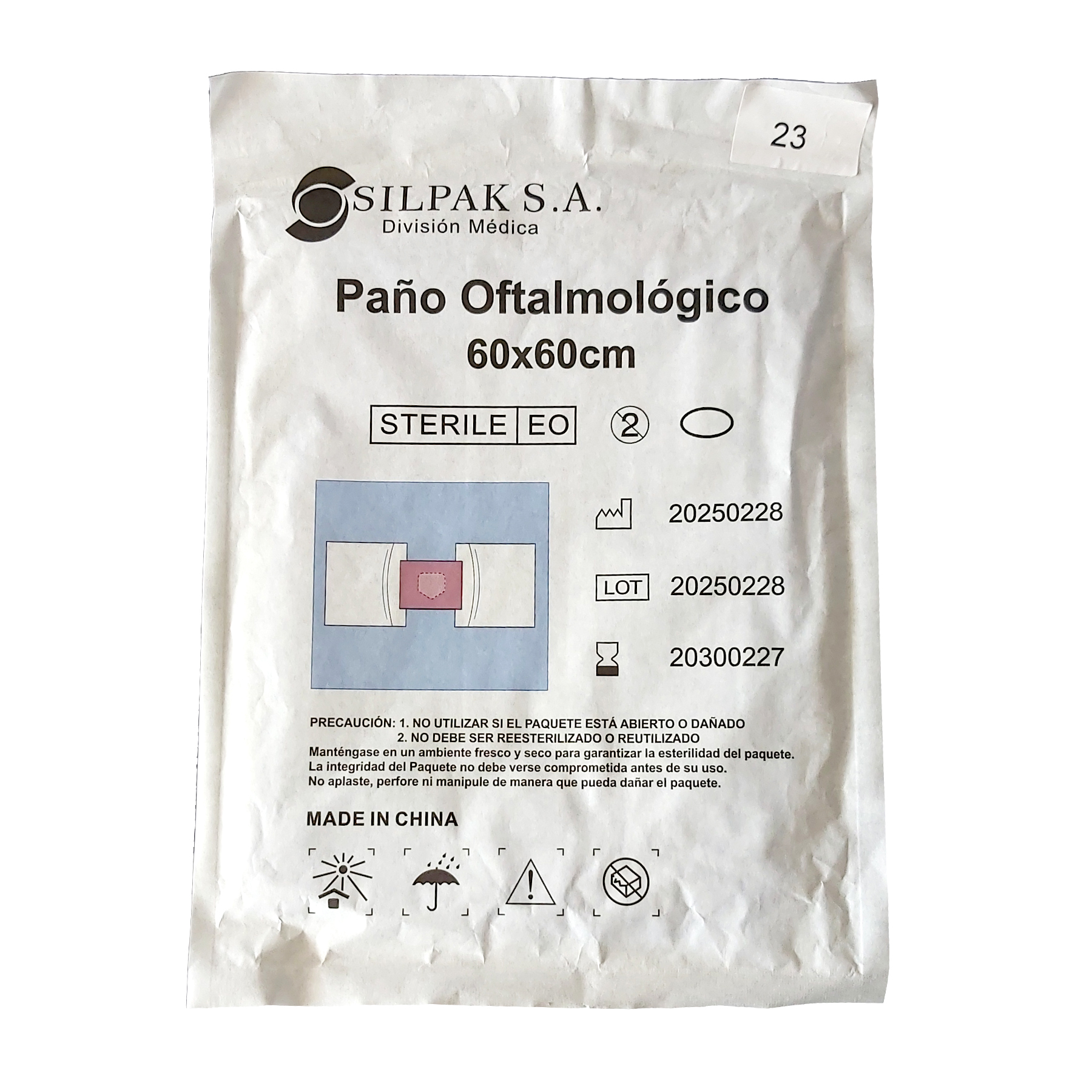El paño oftalmológico SMS es un cobertor estéril usado en cirugías oculares que expone solo el ojo a tratar, tiene una zona reforzada para la incisión y bolsas laterales que recolectan fluidos. Está hecho de material resistente e impermeable, ayuda a mantener la zona limpia y seca, previene infecciones y es de un solo uso.